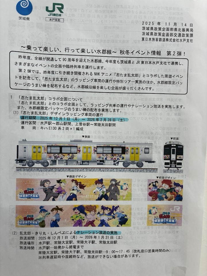 水郡線の全線開通90周年で、12月1日から忍たま乱太郎のラッピング車両が走るそうですよ!